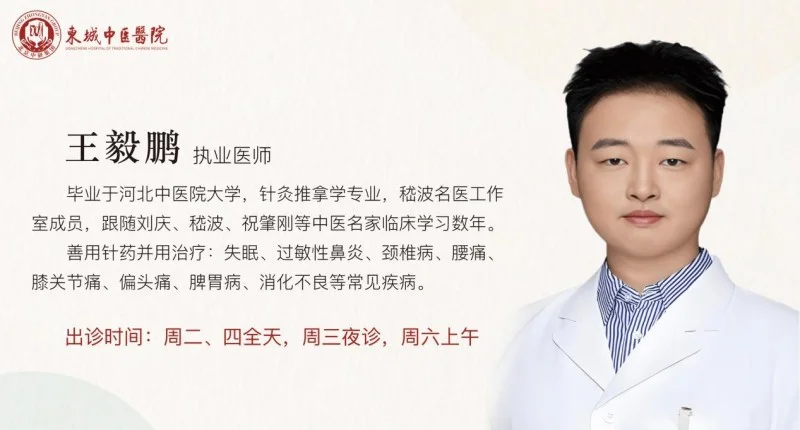 王毅鹏,东城中医医院执业医师,出诊时间周二、四全天,周三夜诊,周六上午。毕业于河北中医院大学,针灸推拿学专业,嵇波名医工作室成员,跟随刘庆、嵇波、祝肇刚等中医名家临床学习数年。善用针药并用治疗:失眠、过敏性鼻炎、颈椎病、腰痛、膝关节痛、偏头痛、脾胃病、消化不良等常见疾病。
